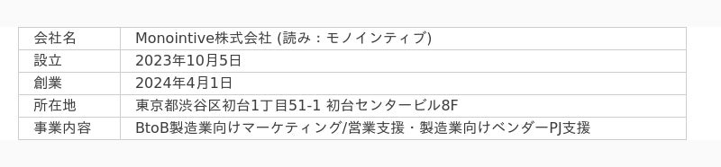 Monointive株式会社(本社:東京都渋谷区、代表取締役社長:斉藤 拓真)は、この度「BtoB製造業特化型のマーケティング体制構築・営業効率化を実現する支援パートナー」として創業することなりました。
