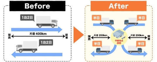 『EW三ケ日コネクトステーション』とは、長距離輸送を複数のドライバーで分担する中継輸送をサポートする中継輸送拠点施設となっており、関東エリア⇔関西エリアからのトラックドライバーが、当該施設で乗務員交代・ヘッド交換を行うことで走行距離・走行時間・労働時間が短縮され、長距離運行することなく日帰りでの運行も可能となります。