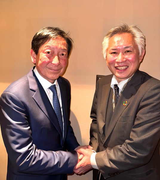 JASPASの岡田社長(左)と東京アンテナ工事の三矢社長(右)