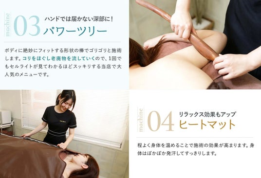 痩身マシンとハンドマッサージ、パワーツリーという特殊な棒を使った痩身施術で体に溜まった老廃物を徹底的にケアする施術が大変好評。