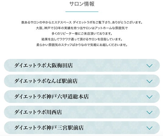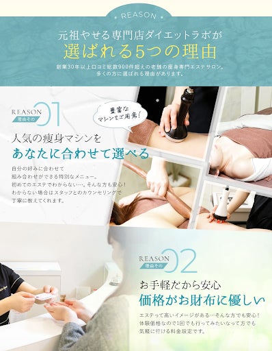 リピーターのお客様にご愛顧頂いているエステサロンです。スタッフのダイエットに関する知見も豊富で、