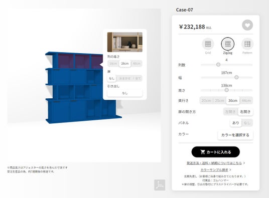 「ituki」は、オンライン上で3Dシミュレーターを使用し、自身でアイテムの幅や高さ、棚数などを選択し、そのまま注文できるオーダー収納家具です。