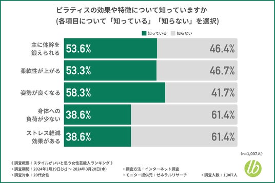 各項目について「知っている」と回答した方の割合は『主に体幹を鍛えられる(53.6%)』『柔軟性が上がる(53.3%)』『姿勢が良くなる(58.3%)』『身体への負荷が少ない(38.6%)』『ストレス軽減効果がある(38.6%)』という結果になりました。