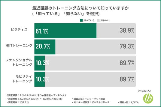 また、最近話題のトレーニングの認知度に関する設問では、主に芸能人が多く取り組んでいる事でインターネット上で話題になったことで「ピラティス」の認知度が高まっていることが示唆されました。