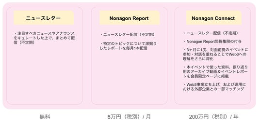 Nonagon Reportと不定期に配信されるニュースレターを通じて得た知識やインスピレーションを、実際にWeb3を事業に取り込んでいる専門家や有識者との対話を通じ、Web3に関する解像度を高め、新規事業の立ち上げ・推進に生かせる知見を提供します。双方向のインプットの場として、各業界からWeb3に取り組む大企業の専門家を招いたディスカッションの機会を得られることが、このプランの特徴です。ディスカッションイベントは、参加者の負担を軽減するとともに、当日の体験をより良くするための準備期間を設ける観点から、四半期(3ヶ月)に一度のペースで開催します。Nonagon Reportの内容に基づいて開催するため、参加者間で共通の事前知識がある状態でディスカッションが可能となるため、単にセミナーに参加して得られるもの以上の情報や知見、洞察を得ることができます。事前にレポートで知識を得た参加者同士の交流は、事前知識や明確な目的意識を持つ企業担当者間の濃密な意見交換が可能になると信じております。本ディスカッションは前後半に分かれており、後半は録画・録音なしのオフレコディスカッションとなる予定で、「ここだから聞ける」内容に触れる機会を提供します。料金体系と提供内容