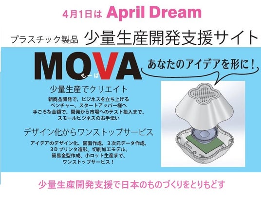 昌和プラスチック工業株式会社 (所在地 千葉県茂原市 代表取締役 内川 毅)は4月1日を夢を発信する日にしようとするApril Dream に賛同します。このプレスリリースは「少量生産開発支援サイトMOVA」の夢です