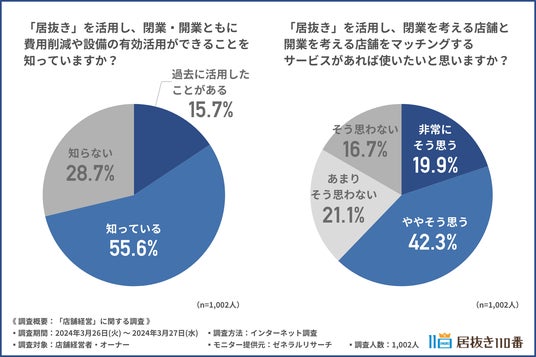 「『居抜き』を活用し、閉業・開業ともに費用削減や設備の有効活用ができることを知っていますか?」と質問したところ、半数超の方が『知っている(55.6%)』と回答しました。また、実際に活用したことがある店舗経営者やオーナーの方も一定数いるようです。居抜きとは店舗に営業設備、備品、家具などがついたまま売買、もしくは賃貸借されることです。