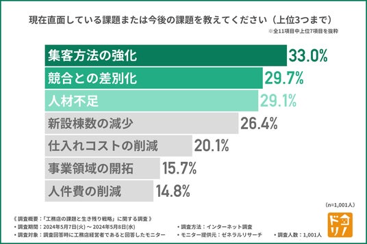 次に、「現在直面している課題または今後の課題を教えてください(上位3つまで)」と質問したところ、『集客方法の強化(33.0%)』と回答した方が最も多く、次いで『競合との差別化(29.7%)』『人材不足(29.1%)』と続きました。