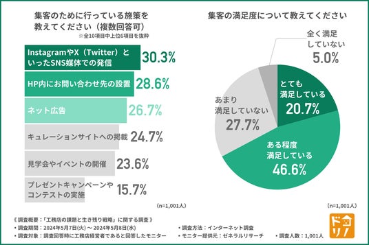 では実際に集客はできているのでしょうか。「集客の満足度について教えてください」と質問したところ、『とても満足している(20.7%)』『ある程度満足している(46.6%)』『あまり満足していない(27.7%)』『全く満足していない(5.0%)』と回答しました。「とても満足している」「ある程度満足している」を合わせると約7割になることから、現在の施策で集客効果が実感できている方は多いようです。しかしながら、一方で約3割がインターネットからの集客に満足していないことも示されました。