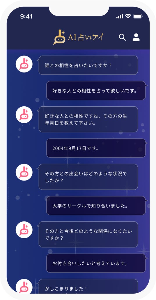 アイに悩みを打ち明けると、コミュニケーションを続ける事で深く分析を行いながら、占いの回答を導き出します。