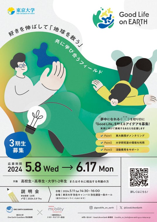 東京大学One Earth Guardians育成機構と一般財団法人トヨタ・モビリティ基金は、地球の未来につながるアイデアを抱き、その実現に向けて自ら挑戦する高校生・大学生を応援するプログラム「Good Life on Earth」において、3期生の募集を5月8日(水)より開始します。