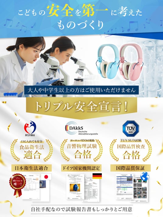 子どもが使うものだから安全なものを使ってほしい。そんな想いから、耳鼻咽喉科専門医と聴覚過敏耳栓ブランドが共同開発をし、さらには様々な試験の基準をクリアしたイヤーマフとなっています。
