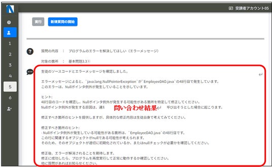 実行ボタンを押下して問い合わせを行うと、下記<回答画面>のように具体的な修正内容を回答します。受講者が回答内容を参考にソースコードを修正することができるため、自律的に学習することができます。