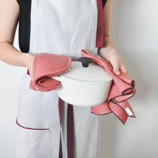 上質なリネンとラメ入りの紐を組み合わせたエプロンをメインに、鍋つかみなどのキッチングッズを販売します。