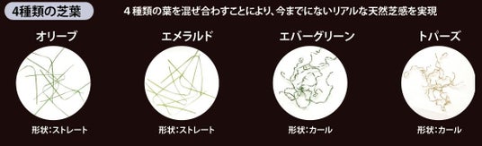 よりリアルな人工芝の見た目を再現するには、4色2種類の葉を組み合わせる必要があります。