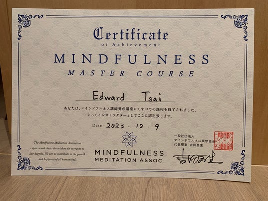ツァイは東京で瞑想の先生たちに会い、自身も日本マインドフルネス瞑想協会から指導者資格を取得しています。