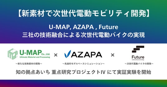 株式会社U-MAP(以下、U-MAP)とAZAPA株式会社(以下、AZAPA)が「あいち重点研究プロジェクトIV期*1」(以下、本プロジェクト)内で推進する”超高効率エレクトロニクスを実現するMBD*2と融合した革新的素材開発”(以下、本開発テーマ)において2024年4月より実証パートナーとしてFuture株式会社(以下、Future)が参画いたします。本開発テーマは、電動モビリティに関連する熱マネジメント問題の解決と性能向上を目的としています。放熱素材の開発を手掛けるU-MAP、モデルベースシミュレーションを得意とするAZAPA、そして電動バイクのメーカーであるFutureが連携し、次世代電動バイクの開発を進めて参ります。▻これまでの成果の活用