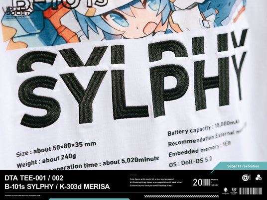 DTAは商品ごとに様々なイラストレーターによってキャラクターが生み出されています。今回のアパレル商品でフィーチャーする「B-101s シルフィー」はBLADE氏、そして「K-303d メリッサ」は黒星紅白氏と、いずれも超人気イラストレーターの手によりデザインされた可愛らしいキャラクターとなっています。