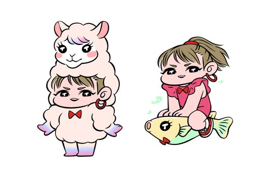 イガリシノブが発案し、イラストレーターのウチボリシンペが本展のために描きおこした「イロパカ」(左)と「チョメダカ」(右)