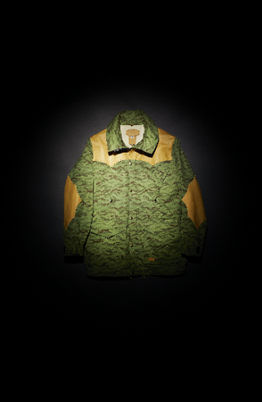 ハリー・スティーブンソン社のハイブリッドコットン生地を使用し、デジタルプリントされたマウンテンカモ柄を施す。生地の質感はややマットな仕上げ、雨や雪、風を防ぐだけでなく、汗などの不快な湿気も逃す。