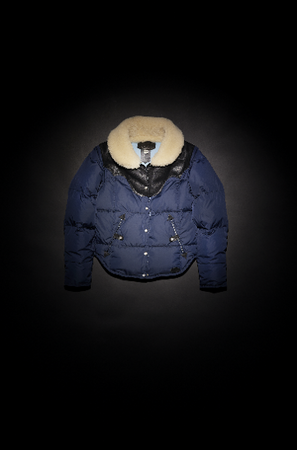 首回りの構造が他にない襟にもなりスタンドカラーにもなる特徴的なデザイン。また馬乗り、いわゆるライダーにとってまとわりつかない着丈短く重宝されるショート丈ダウンジャケット。