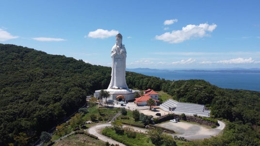 小豆島大観音は1995年に建立以来、皆様のしあわせを小豆島の高台より願っています。また、アークプラス国際作品コンテスト(建築・設計部門の世界的に権威のあるコンテスト)でグランプリを獲得し、名実ともに世界一美しい観音さまとして認められております。寺内は、胎内巡りになっていて、壁には一面の仏像があり、その数はなんと14000体。