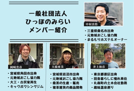 元丸森町地域おこし協力隊の3人と3年前に筆甫に移住した1名の計4名の移住者で設立いたしました。このメンバーは一緒に地域イベントを運営していたメンバーが元となっています。