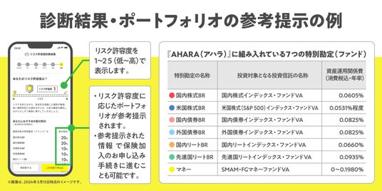 『AHARA(アハラ)』をご契約中のお客さまは、ロボアドサービスを設定いただくことで、お客さまのリスク許容度に応じた最新のポートフォリオへ自動的に特別勘定(ファンド)の積立金を移転(スイッチング)でき、この取扱いは日本初※3となります。