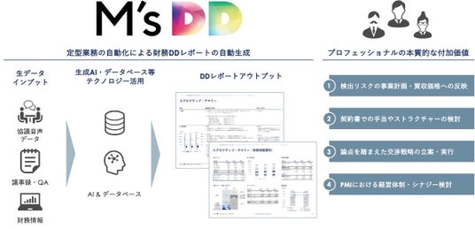 統合型M&Aアドバイザリー事業を展開するGIP株式会社(本社:東京都千代田区)は、財務デューデリジェンス(財務DD)レポートを自動生成するAIシステム「M’s DD(エムズ ディーディー)」の開発、運用を開始しました。財務DDレポートの自動生成により、M&A関連業務効率化および業務均質化を実現し、より幅広いクライアントに向けたアドバイザリー業務の最大価値を提供する体制を構築していきます。