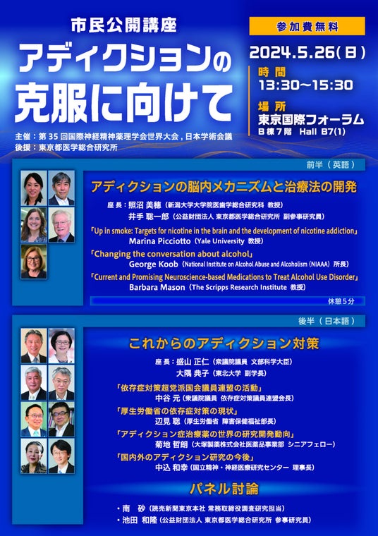 2024年5月26日(日)の13:30-15:30に東京国際フォーラムで国際神経精神薬理学会(CINP)の無料の市民公開講座を開催します。「アディクションの克服に向けて」と題して、日本の今後の依存症対策について討論が行われます。