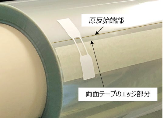 1.原反を繰り出し軸にチャッキングし、市販のスプライス用両面テープを、原反始端部に貼り付けます。このとき、原反始端部と、両面テープのエッジ部をできるだけ合わせます。