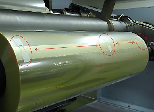 この装置では、使用中の原反が残りわずかになると、もう一軸に準備された原反がスプライスに備え、予備回転(空転)します。その際、原反の始端部が、重力や風圧により巻きほどけるため、これを防止する手段が必要です。一方、スプライス時には、新しい原反の始端部が開き、スムーズに繰り出される必要があります。この2つの機能を併せ持たせた製品が、スプライスアシストシール(TM)です。