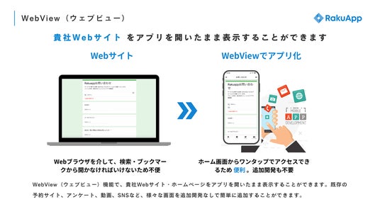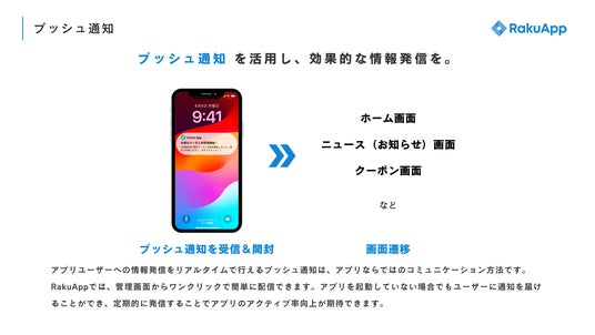 「RakuApp(ラクアップ)」は、プログラミング知識がなくても簡単にスマートフォンアプリを導入できるサービスです。サービスの特色は以下の通りです。
