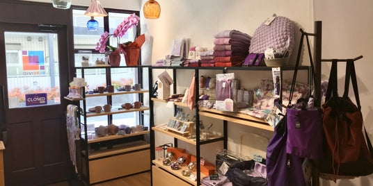 店内は所狭しと紫色の雑貨が並んでおり、特にこだわりがあるのは、紫色の美濃焼陶器とイタリアンレザーです。紫色に特化したオリジナルの陶器を作りたい、という思いから、4色の紫色(日本の伝統食である浅紫・淡紅藤・古代紫・梅紫)を選びました。カップ&ソーサー・マグ・皿・ボウルなどを取り揃えています。