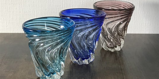 流線形が特徴的な「琉球ガラス工房晴天」のモールグラス 水色・青・紫 販売価格2,640円(税込)