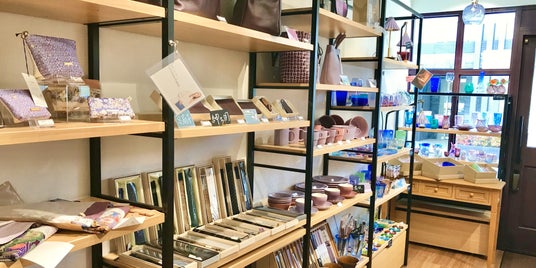沖縄県の工房で手作業により作られた世界に1つだけのオリジナルグラスはプレゼントにも。インスピレーションを高めてくれる「紫色」の雑貨も約250点以上販売中