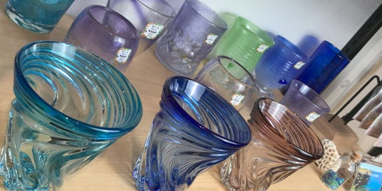 沖縄の海を象徴とした鮮やかな青や緑のグラス