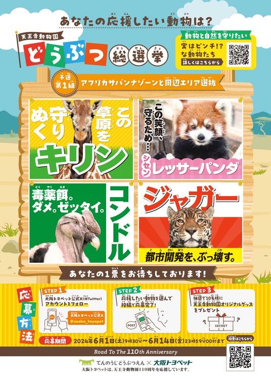 大阪トヨペット株式会社(本社:大阪市東成区深江北2丁目14番1号/仮移転)は6/1(土)より、来年2025年に開園110周年を迎える地方独立行政法人天王寺動物園(大阪市天王寺区茶臼山町1-108)と共に、大阪の未来づくりに向けた取り組み『Road to 110th』を共同開催いたします。第1弾目は、X(旧Twitter)上で展開される『どうぶつ総選挙』。天王寺動物園内の各エリア別選抜の応援したい動物に投稿することでNo,1を決めます。自然環境や生物多様性など動物の置かれている現状を知るきっかけづくりを目的として本イベントを開催いたします。年間を通して様々なイベントやキャンペーンを予定していますので、詳しくはキャンペーン特設サイトをご確認ください。