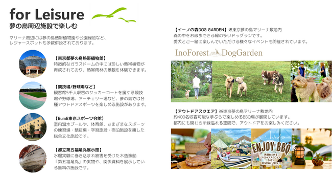 夢の島公園は、マリーナとしての機能はもちろん、レジャーエリアとしてもたくさんの施設が併設されており、東京夢の島マリーナ敷地内だけではなく夢の島公園全体を楽しんでいただけるよう他のレジャー施設と連携することにより、お客様に「わくわく感」「満足感」「非日常感」をご提供してまいります。