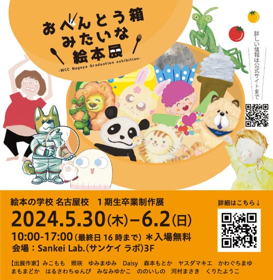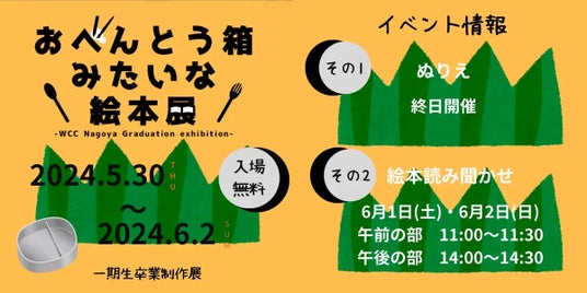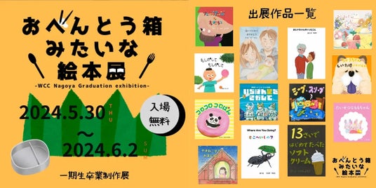 名古屋校の第1期生として13名の生徒が1年間のカリキュラムを経て、各々の作品を制作した。その作品を展示するイベント「おべんとう箱みたいな絵本展」を5月30日~6月2日に開催する。展示作品を自由に読むことができるだけでなく、読み聞かせイベントや塗り絵などお子様が楽しめるイベントも行います。生徒との交流やオリジナル雑貨の購入、三恵社がこれまで発行してきた絵本も自由に読むことができます。入場は無料です。