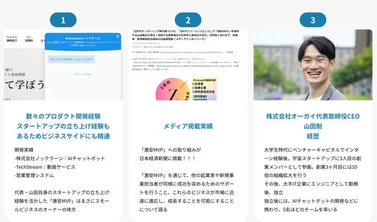 株式会社オーガイは、起業家や新規事業担当者が同様に成功を収めるためのサポートを行うこと、これらのビジネスが市場に迅速に適応し、成長することを実現するために立ち上がったスタートアップです。主要事業である「激安MVP」(受託開発)は、代表・山田自身のスタートアップの立ち上げ経験を活かしたサービスとなっており、まさにスモールビジネスのオーナーの味方となるサービスです。