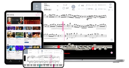 さらに音楽とともに画面上のガイド線が動くため、いつでも演奏のタイミングの確認が可能。自動的に楽譜がスクロールされるため、楽譜めくりが不要です。画面上でテンポを調整したり、楽譜へ書き込んだり、自身の演奏を録音したりできるなど、よりインタラクティブな楽器練習体験を実現しました。