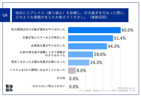 Q7で「ある」と回答した方に、「Q8.他社にリプレイス(乗り換え)を依頼し、引き継ぎを行なった際に、どのような課題が生じたか教えてください。(複数回答)」(n=70)と質問したところ、「前の開発会社の引継ぎ資料が不十分だった」が60.0%、「引継ぎ後にエラーなどが発生した」が51.4%、「成果物の質が不十分だった」が44.3%という回答となりました。