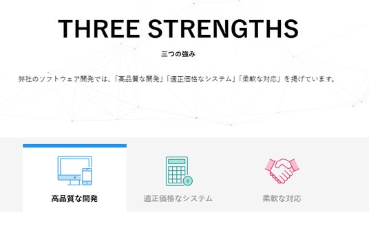 株式会社もばらぶのソフトウェア開発では、「高品質な開発」「適正価格なシステム」「柔軟な対応」の“THREE STRENGTHS”(三つの強み)を掲げています。