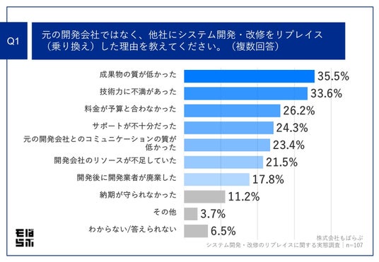 「Q1.元の開発会社ではなく、他社にシステム開発・改修をリプレイス(乗り換え)した理由を教えてください。(複数回答)」(n=107)と質問したところ、「成果物の質が低かった」が35.5%、「技術力に不満があった」が33.6%、「料金が予算と合わなかった」が26.2%という回答となりました。