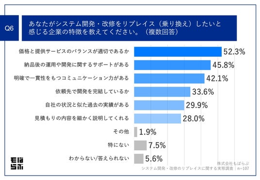 「Q6.あなたがシステム開発・改修をリプレイス(乗り換え)したいと感じる企業の特徴を教えてください。(複数回答)」(n=107)と質問したところ、「価格と提供サービスのバランスが適切であるか」が52.3%、「納品後の運用や開発に関するサポートがある」が45.8%、「明確で一貫性をもつコミュニケーション力がある」が42.1%という回答となりました。