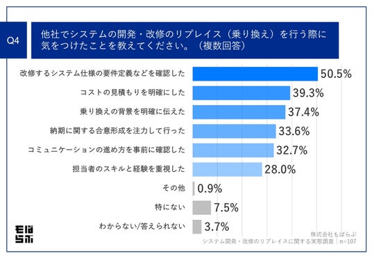 Q4.他社でシステムの開発・改修のリプレイス(乗り換え)を行う際に気をつけたことを教えてください。(複数回答