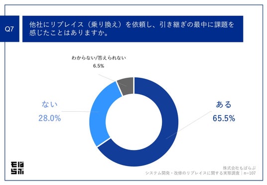 「Q7.他社にリプレイス(乗り換え)を依頼し、引き継ぎの最中に課題を感じたことはありますか。」(n=107)と質問したところ、「ある」が65.5%、「ない」が28.0%という回答となりました。