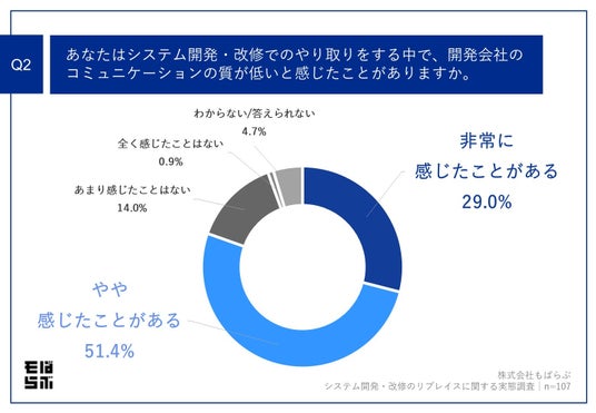 「Q2.あなたはシステム開発・改修でのやり取りをする中で、開発会社のコミュニケーションの質が低いと感じたことがありますか。」(n=107)と質問したところ、「非常に感じたことがある」が29.0%、「やや感じたことがある」が51.4%という回答となりました。