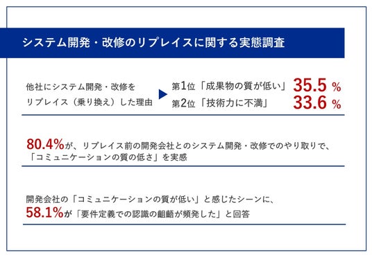 まず、元の開発会社ではなく、他社にシステム開発・改修をリプレイスした理由については、「成果物の質が低かった」が35.5%で最も多く、次いで「技術力に不満があった」が33.6%でした。さらに、80.4%がリプレイス前の開発会社に対し「コミュニケーションの質の低さ」を実感していることがわかりました。実際にコミュニケーションの質の低さを感じたシーンは、「要件定義での認識の齟齬が頻発した」(58.1%)や「質問や相談に対する対応が遅かった」(51.2%)が、高い割合でした。また、リプレイスの際に注意した点としては、「改修するシステム仕様の要件定義を確認した」(50.5%)が最多となり、引き継ぎの際に生じた課題は、「前の開発会社の引継ぎ資料が不十分だった」(60.0%)、「引継ぎ後にエラーなどが発生した」(51.4%)が上位となりました。
